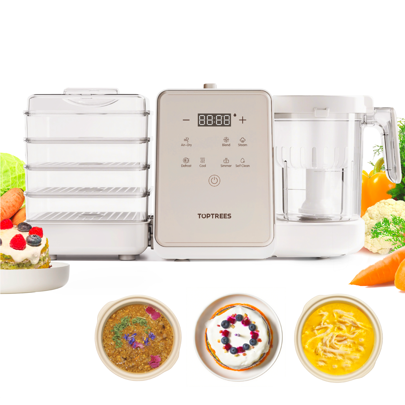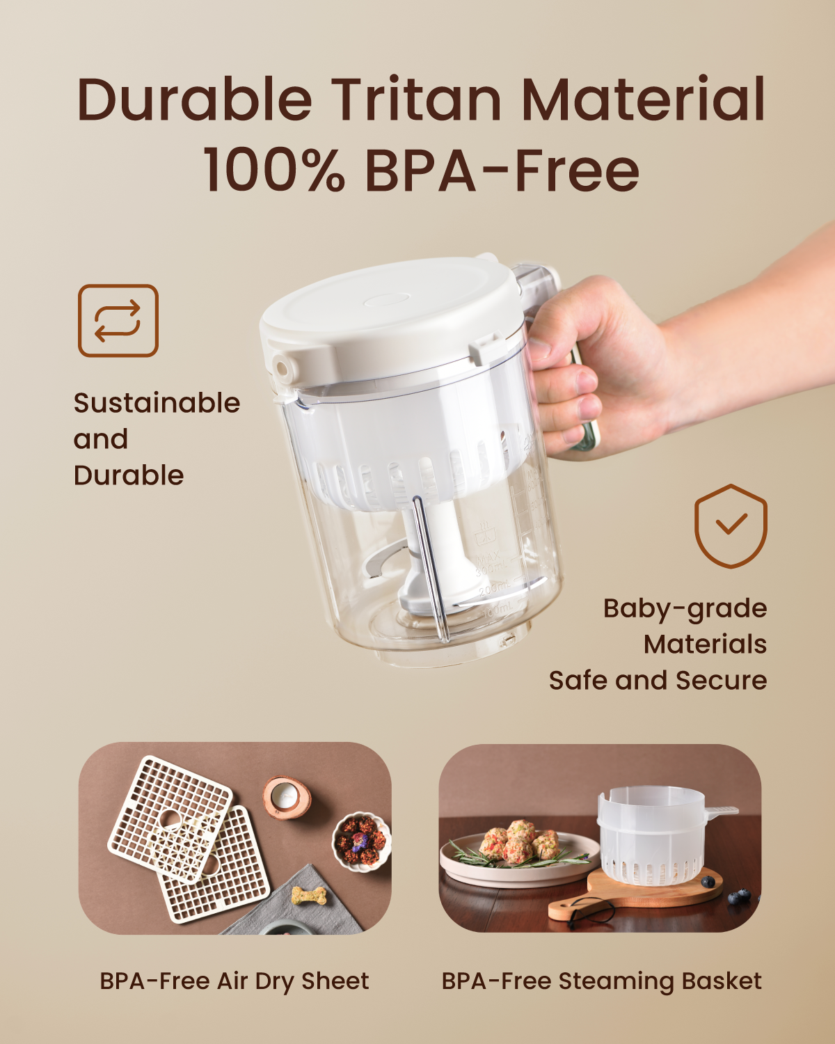 - Food-grade Safe Materials: The blending cups of the pet treats maker, with a capacity of 1.3qt, are made of high-quality Tritan material—a premium, baby-grade, food-contact-safe plastic that is safe for high-temperature use. The drying module, with a total capacity of 4.2qt, features drying sheets is made of PA material, while the steaming basket, with a 0.6qt capacity, is made of PP. All these materials are food-grade and reliable, ensuring that your pet's food is never exposed to harmful substances.